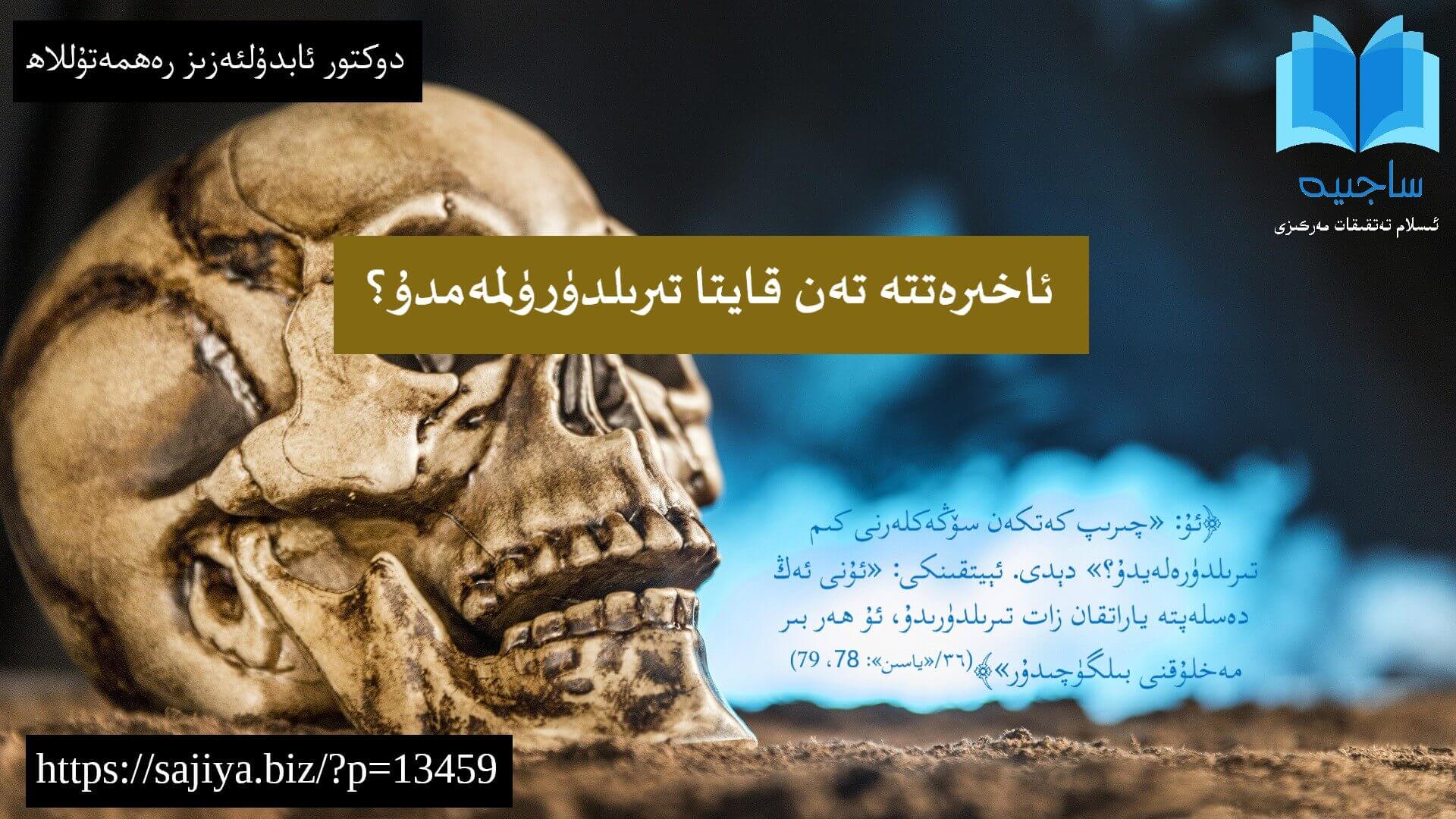 ﴿ئۇلار: «بىز ئۆلۈپ توپىغا ۋە قۇرۇق سۆڭەككە ئايلانغان چاغدا بىز چوقۇم تىرىلدۈرۈلەمدۇق؟ ئاتا – بوۋىلىرىمىزمۇ تىرىلدۈرۈلەمدۇ؟» دەيتتى. ئېيتقىنكى، «ئىلگىرىكىلەر ۋە كېيىنكىلەر مەلۇم كۈننىڭ مۇئەييەن ۋاقتىدا (يەنى قىيامەتتە) توپلىنىدۇ. ئاندىن سىلەر، ئى قايتا تىرىلىشنى ئىنكار قىلغۇچى گۇمراھلار! چوقۇم زەققۇم دەرىخىدىن يەيسىلەر، ئۇنىڭدىن قورساقلىرىڭلارنى تولدۇرىسىلەر، ئۇنىڭ ئۈستىگە ھارارىتى يۇقىرى بولغان قايناقسۇنى تەشنا بولغان تۆگىلەردەك ئىچىسىلەر. مانا بۇ، ئۇلارنىڭ قىيامەت كۈنىدىكى زىياپىتىدۇر. (ئىنسانلار!) سىلەرنى بىز ياراتتۇق، سىلەر قايتا تىرىلىشكە ئىشەنمەمسىلەر؟ سىلەر (ئاياللارنىڭ بەچچىدانىغا) تۆكۈلگەن مەنىينى دەپ بېقىڭلارچۇ؟ ئۇنى سىلەر (ئىنسان قىلىپ) يارىتامسىلەر؟ ياكى بىز (ئىنسان قىلىپ) يارىتامدۇق؟ بىز سىلەرنىڭ ئاراڭلاردا ئۆلۈمنى بەلگىلىدۇق (يەنى ھەر بىرىڭلارنىڭ ئۆلۈش ۋاقتىنى بېكىتتۇق)، سىلەرنى باشقا بىر قەۋمگە ئالماشتۇرۇشتىن ۋە سىلەرنى سىلەر بىلمەيدىغان بىر شەكىلدە يارىتىشتىن ئاجىز ئەمەسمىز. شۈبھىسىزكى، سىلەر دەسلەپكى يارىتىشنى بىلدىڭلار (يەنى دەسلەپتە ئاللاھنىڭ سىلەرنى يوقتىن بار قىلغانلىقىنى تونۇدۇڭلار). سىلەر (ئاللاھنىڭ سىلەرنى دەسلەپ ياراتقاندەك قايتا يارىتىشىنى) ئويلىمامسىلەر؟﴾(56/«ۋاقىئە»: 47 – 57)
