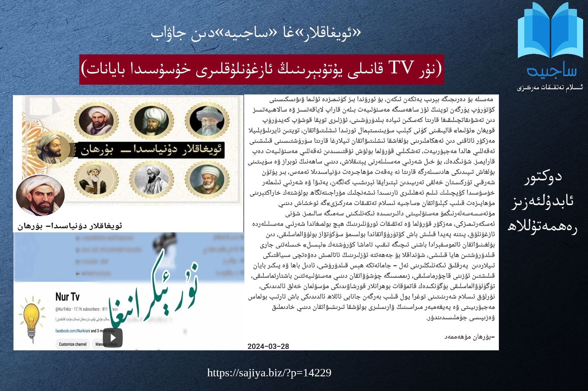 «ئويغاقلار دۇنياسىدا – بۇرھان» سەھىپىسىدە قەلەم تەۋرىتىپ كېلىۋاتقان بۇرھان مۇھەممەد ئىسىملىك يازار شەرئىي مەسىلىلەرگە دائىر يېقىنقى ئوبزورلىرىدىن بىرىدە يۇتىيوپتا ئىسلامىي تەشۋىقاتلارنى ئاساس قىلىپ بەلگىلىك دەرىجىدە كۆرۈرمەنلىرى بولغان نۇر TVقانىلىدىكى «يۇتۇبېر» ھەققىدە پاكىتچانلىقى كۈچلۈك، نەزەرىيىۋىي تەھلىلى بىر قەدەر ئەتراپلىق تەنقىد ماقالىسى ئېلان قىلغان بولۇپ، ئوبزوردا مۇھاجىرەتتىكى دىنىي مۇئەسسەسەلەرنى، جۈملىدىن «ساجىيە ئىسلام تەتقىقات مەركىزى» قاتارلىق ئورۇنلارنى تىلغا ئېلىپ، «شەرئىي مەسىلىلەردە ئازغۇنلۇق، پىتنە پەيدا قىلىش قاتارلىق قىلمىشلارغا قارىتا سۈكۈت قىلماسلىق، دىن بۇلغىنىۋاتقان ئاتموسفېرادا باشنى ئىچىگە تىقىپ تاماشا كۆرمەسلىك، دىنىي مەسئۇلىيەتتىن باش تارتماسلىق، ئادىل باھا ۋە پىكىر بايان قىلىشتىن ئۆزىنى قاچۇرماسلىق» ھەققىدە تەلەپ ئوتتۇرىغا قويغان ۋە بۇ مۇئەسسەسەلەر ھەمدە ئورگانلارنى دىنىي ساھەلەردە يۈز بېرىۋاتقان بىنورمال ھادىسىلەرگە «سۈكۈتۋاز» بولماسلىققا چاقىرغان.